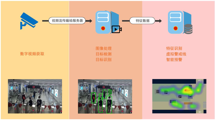 通过车站站厅、站台以及各出入口的摄像头,实时获取客流数据,并对客流数据进行分析,能实时反馈车站客流分布实况,针对乘客行为进 行分析检测并发出异常报警,提升车站运营效率。